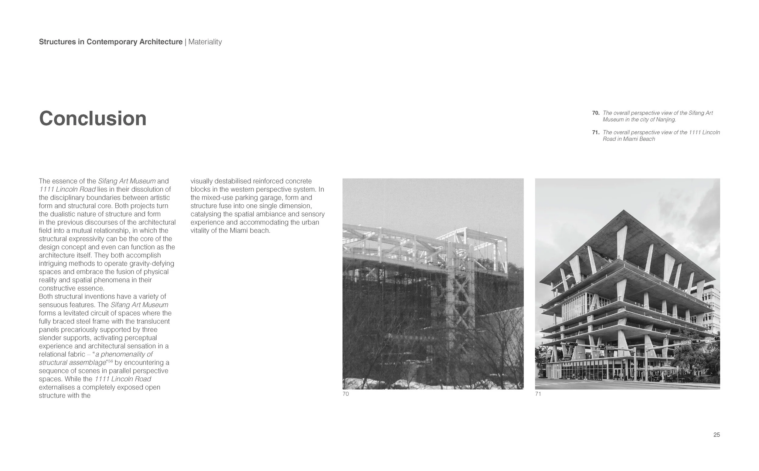 In contemporary architecture, the fusion of form and structure nurtures new constructive readability that distinguishes the architectural space from that of all prior eras. The Nanjing Sifang Art Museum and 1111 Lincoln Road, as two representative instances, both challenged the dichotomy between the “Kunstform” (artistic form) and the “Kernform” (inner structure). This study focused on structures in contemporary architecture and used the pair of buildings: Sifang Art Museum and 1111 Lincoln Road to study how they lie in their dissolution of the disciplinary boundaries between artistic form and structural core. Both projects turn the dualistic nature of structure and form in the previous discourses of the architectural field into a mutual relationship, in which the structural expressivity can be the core of the design concept and even can function as the architecture itself.